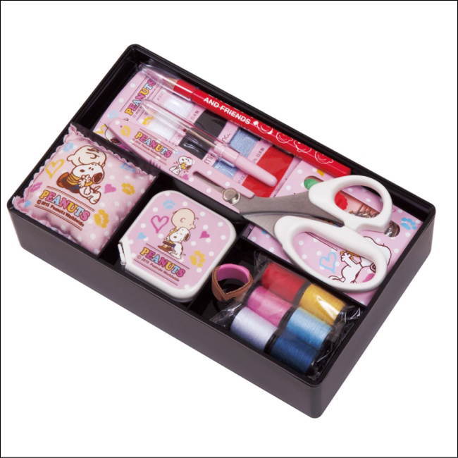 ◆フラットなフタが付いたコンパクトなケース入りです ◆道具もスヌーピーでいっぱい!手芸が楽しくなるセットです ◆フタいっぱいにスヌーピーの顔がプリントされています ケースサイズ 202×124×60mm トレイサイズ 197×121×22mm 材質 PP樹脂(ケース・トレイ) 【セット内容】 ・洋裁はさみ(17cm) ・オートメジャー(2m) ・ニードルセット ・ピンクッション ・ポリエステルスパン糸6色(ボビン巻き) ・ポリエステルスパン糸4色 ・チョークペンシル ・リッパー ・セル皮ゆびぬき(短針用) ソーイングセット 裁縫道具 小学校 家庭科 中学生 大人 人気 おすすめ かわいい スヌーピー